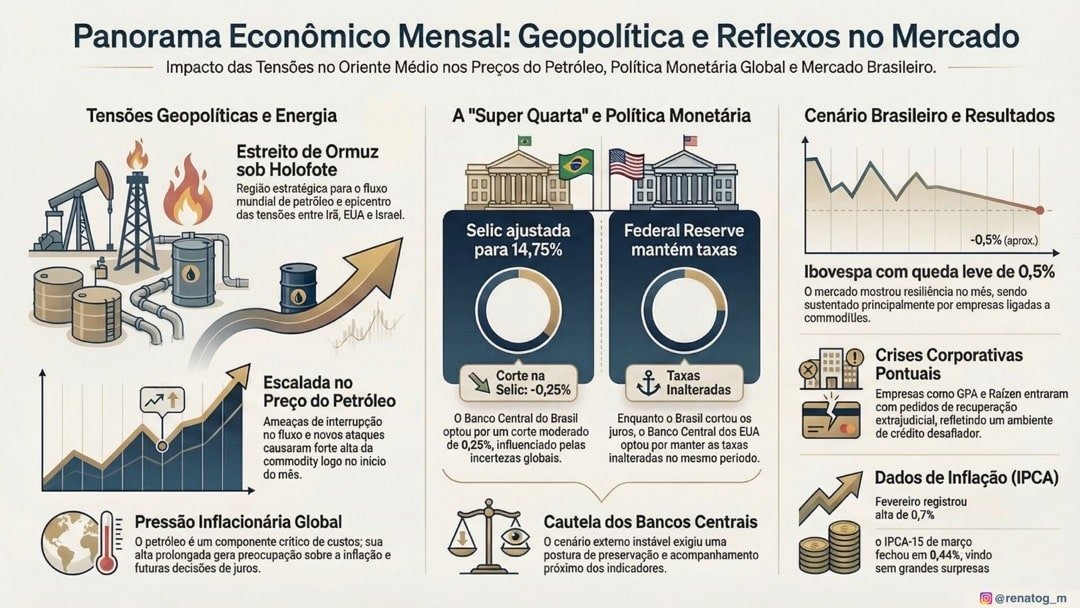 O mês começou com uma escalada relevante no cenário geopolítico, com ataques envolvendo Irã, Estados Unidos e Israel, elevando a aversão a risco global. Um dos pontos centrais dessa tensão foi o Estreito de Ormuz, região estratégica por onde passa boa parte do petróleo, fertilizantes, gás mundial. Com ameaças de interrupção no fluxo e novos ataques, vimos uma forte alta do petróleo logo no início do mês, ao mesmo tempo em que as bolsas reagiam com bastante volatilidade, inclusive no Brasil, com quedas expressivas seguidas de recuperações rápidas.